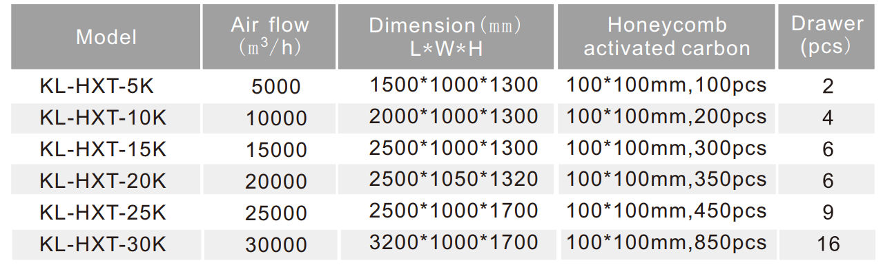 | Model | Air flow (m³/h) | Dimension (mm) (L × W × H) | Honeycomb activated carbon | Drawer (pcs) |