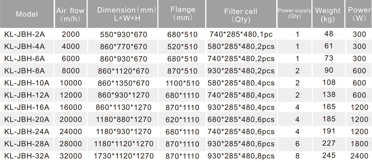 DBH – KL-JBH được phân loại theo lưu lượng gió từ 2.000 đến 60.000 m³/h. Các mã phổ biến bao gồm DBH – KL-JBH 40 cho bếp nhỏ và các hệ thống ghép module DBH – KL-JBH 160 cho khu bếp công nghiệp quy mô lớn.