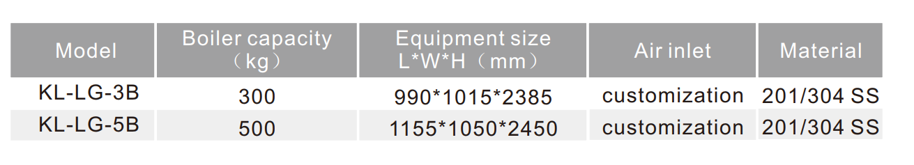 | Model | Công suất nồi hơi (kg) | Kích thước thiết bị LWH (mm) | Cửa gió vào | Vật liệu |