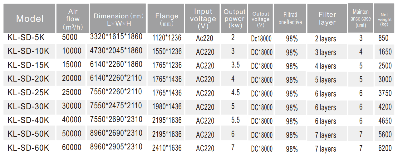 | Model | Lưu lượng gió (m3/h) | Kích thước LWH (mm) | Kích thước mặt bích (mm) | Điện áp đầu vào (V) | Công suất (kW) | Điện áp đầu ra (V) | Hiệu suất lọc | Số lớp phin lọc | Trọng lượng tịnh (kg) |