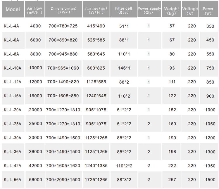 | Model | Lưu lượng gió (m3/h) | Kích thước LWH (mm) | Kích thước mặt bích (mm) | Cấu hình phin lọc (Filter cell) | Số lượng bộ nguồn | Trọng lượng (kg) | Điện áp (V) | Công suất (W) |