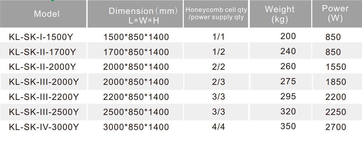 | Model | Kích thước LWH (mm) | Số lượng phin tổ ong / bộ nguồn | Trọng lượng (kg) | Công suất (W) |